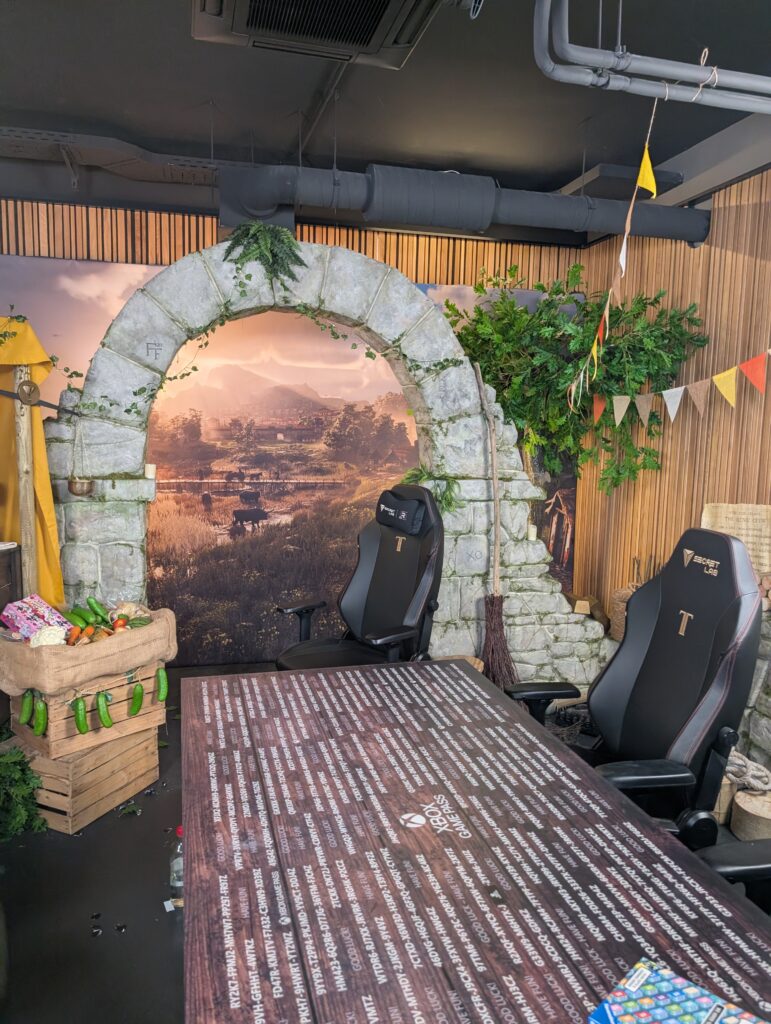 • ein Gaming-Bereich im Albion-Style mit Steingebäuden, Marktplatz und weiteren Bauten